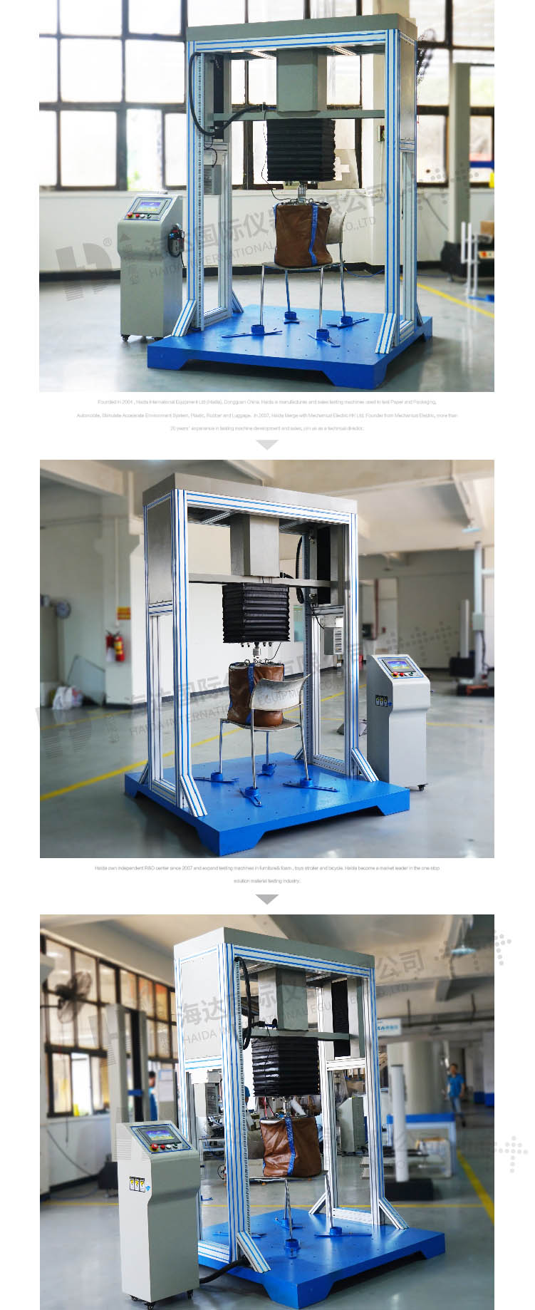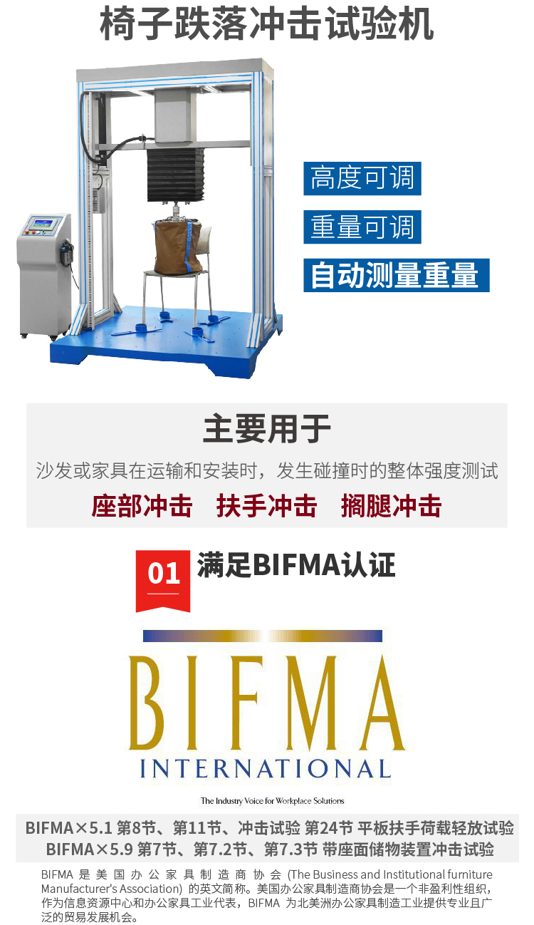 136kg 沖擊包(Bifma× 5.1,第8節(jié)保障性測試用) 57kg 沖擊包(Bifma× 5.1,第11.3節(jié)保障性測試用) 102KG沖擊包(Bifma X5.1,第8節(jié)保障性測試用) 鋼珠 136KG 吸盤 5個 鋼珠袋直徑406mm 1個 設(shè)備主要組成: 1.試驗機由一個堅固的可移動鋁質(zhì)金屬框架及底座組成,有腳輪可移動,腳輪帶剎車。試驗機氣缸軸-推拉試驗高精度電磁鐵和球形引導(dǎo)驅(qū)動齒帶式線性測試軸。位移范圍:300mm;釋放裝置系統(tǒng) 1個。 2.配置要求: ①機架:要求采用鋼材結(jié)構(gòu),表面烤漆處理。 ②底座:國標(biāo)45號鋼,厚度不小于10毫米 ③PLC及模塊單元、氣缸、力量傳感器等要求配置國際知名品牌; ④顯示系統(tǒng):知名品牌工業(yè)計算機;7寸人機界面:國際知名品牌; 3、測試快速更換砂袋 3套。 指標(biāo)要求 1、沖擊砂包:直徑406mm,重57KG沙包。 2、靜壓模塊:直徑406mm重102kg沙包。 3、強度沖擊:直徑406MM重136KG沙包 4、沖擊速度:10-30次/分鐘可設(shè)定。 5、跌落物由電磁系統(tǒng)彈射出來。 6、通過非接觸式鄰近開關(guān),在PLC控制器上設(shè)置跌落循環(huán)次數(shù)和跌落高度。 7、可調(diào)高度:90-135cm。 8、獨立的觸摸屏式控制器;留有數(shù)據(jù)接口,可以通過顯示屏觀察到所有的力值;最后用戶可以獲得一個專業(yè)的測試報告。 9、具有停/斷電記憶及斷點檢出停機功能。 10、停機方式: 到達(dá)試驗次數(shù)停機、試件損壞或變形量過大自動停機并報警。 11、設(shè)備具有故障自診斷系統(tǒng);方便檢查和排除故障。 11、電源:220VAC 5A、50HZ。 | ||