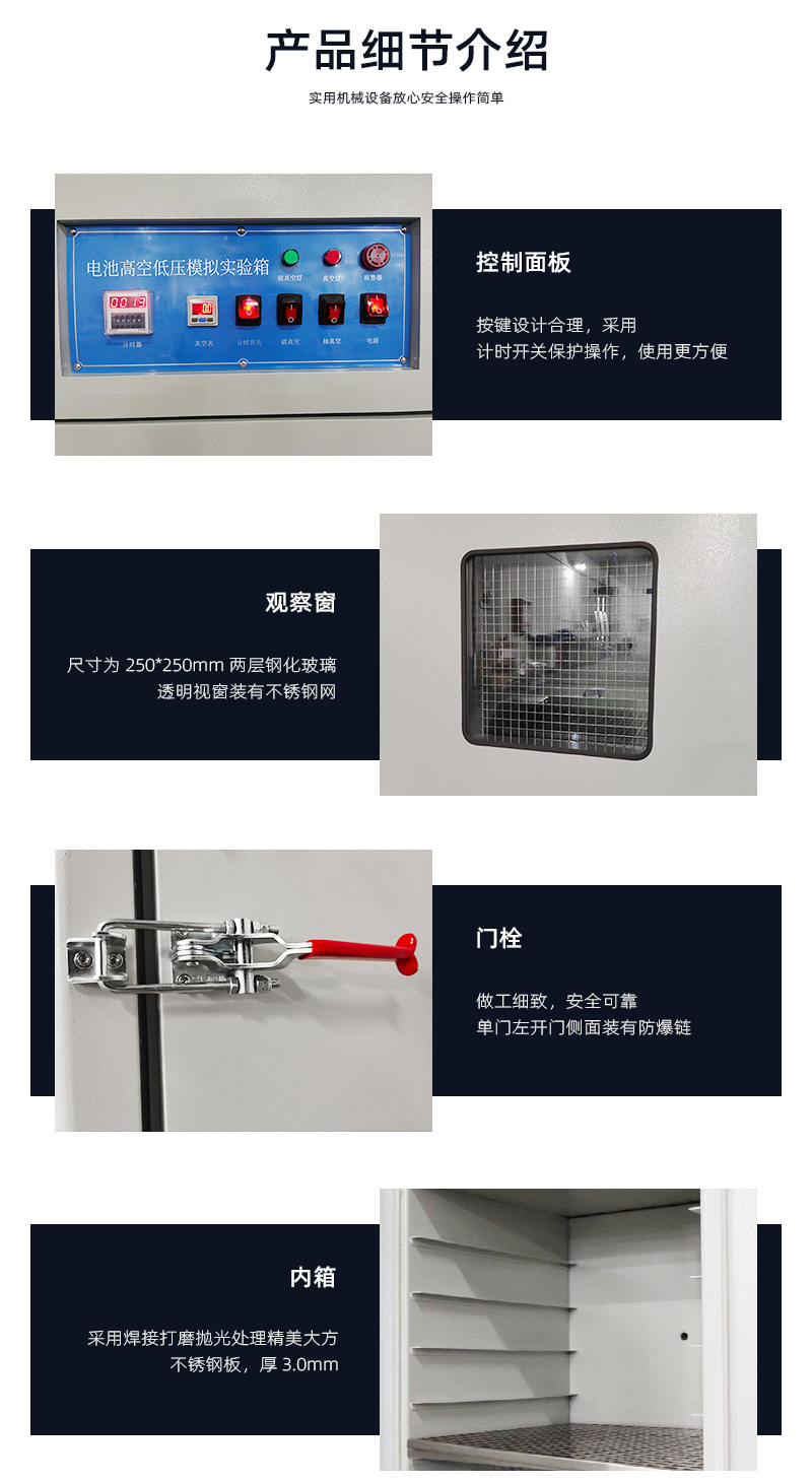1內箱材質: SUS201# 不銹鋼,厚度3mm; 2、外箱材質: A3 冷板烤漆, 厚度1.5mm; 3、壓力范圍: 0.5~100Kpa,常用測試氣壓11.6 Kpa; 4、內箱尺寸: W400xH400xD400mm 5、外箱尺寸: W550xH1200xD550 6、置物隔板材質:不銹鋼; 7、真空度顯示:數(shù)顯式真空表控制,準確顯示真空度,易于設置真空度; 8、計時器: LED數(shù)顯, 在0-9999H內自由設置可(H/M/S秒可切換); 9、 壓力波動:≤5%; 10、 設備使用電源:AC220V,50HZ,2.2KW; | ||