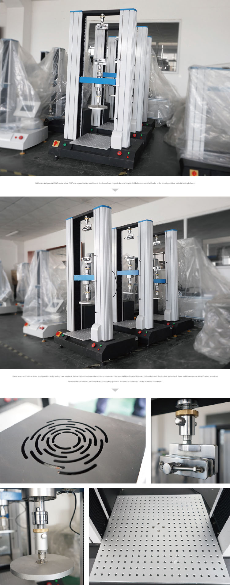 本產(chǎn)品廣泛應(yīng)用于測試各類五金、金屬、橡塑料、鞋業(yè)、皮革、服裝、紡織、絕緣體、電線電纜、端子等材料的拉伸、撕裂、剝離、抗壓、彎曲抗剪力、三點抗折、延伸率,以及對海綿、泡沫等多孔彈性材料的壓縮凹入硬度、壓陷比等各項物性性能的測試。也用于測定海綿、泡沫等多孔彈性材料的壓縮凹入硬度和計算壓陷比 設(shè)計標(biāo)準(zhǔn):GB/10807-2006, ITTC 1.1 硬度測試,ITCC 1.2 壓陷比 ISO2439, ASTM D3574 HG/T 5836-2021 乳膠墊 本標(biāo)準(zhǔn)規(guī)定了乳膠墊的要求、試驗方法、檢驗規(guī)則和包裝、標(biāo)志、運輸與貯存。本標(biāo)準(zhǔn)適用于由天然膠乳、合成膠乳或由天然膠乳與合成膠乳并用的混合膠乳加入配合劑經(jīng)發(fā)泡、硫化等工藝制備的乳膠墊芯與墊套組成的乳膠墊 操作原理 壓陷硬度測試:將試樣置于上、下壓盤間,上壓盤以規(guī)定速度向下壓縮一定的尺寸,按標(biāo)準(zhǔn)要求的A法(B法、C法)進行測試,荷重元將感應(yīng)到的壓力反饋給電腦處理,通過電腦測試界面查看數(shù)據(jù)結(jié)果,從而測得海綿、泡沫等試樣等材料的壓陷硬度。 拉伸測試:沿試樣縱向主軸方向恒速拉伸,直到試樣斷裂或其應(yīng)力(負(fù)荷)或應(yīng)變(伸長)達到某一預(yù)定值,測量在這一過程中試驗承受的負(fù)荷及其伸長量。 | ||