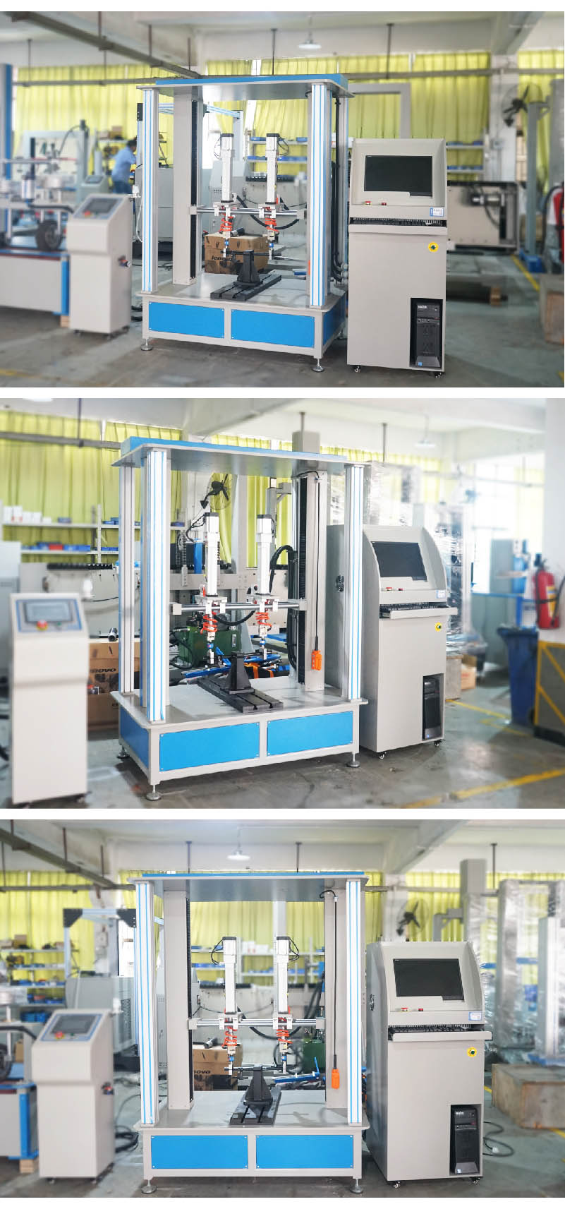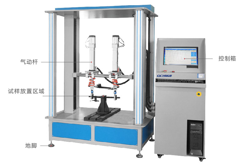 滑板車車把動態(tài)疲勞試驗機HD-J247A-S模擬自行車在實際騎行過程中,在不同的路況下,車把組件會受到人手給予的不同方向的力,尤其是在較顛簸路面上騎行時,受到的力就比較大和頻繁,因此車把組件的質(zhì)量好壞關系到整個車子的使用安全性和使用方便快捷性。本試驗機是根據(jù)EN14764、EN14766和EN14781相關疲勞試驗相關標準設計,整個試驗系統(tǒng)通過計算機自動控制,力量的施加系統(tǒng)采用力閉環(huán)控制,當施加在車把上的試驗力達到設定的力量時自動返回換向。 設計標準:滿足ISO 4210-5-2014 (ISO標準) 4.9 一和二階段加載方式 試驗方法:試驗時將車把組件按照標準規(guī)定的方法固定在試驗機上,加載橫梁的高低位置可以通過手動調(diào)節(jié)來適應車把立管的大小;將車把立管(或假示把立管)固定在專用夾具上,調(diào)整加載氣缸的上下、左右位置,使加載夾具可以剛好裝配在把橫管上,固定好各個部分。在計算機上設定好試驗要求的試驗力值、次數(shù)。調(diào)整好允許車把的Z大變形量,超過此變形量后機臺會自動停止測試;啟動試驗程序開始測試,試驗達到設定次數(shù)或試件損壞,機臺自動停止測試并保留試驗結(jié)果。 |