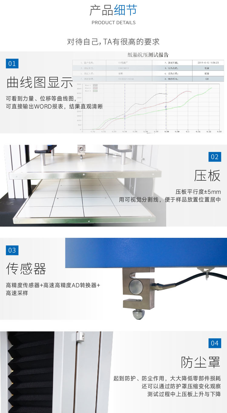 電腦式紙箱抗壓機是檢驗紙箱或其它包裝容器耐壓強度較直接的測試儀器,用于判定紙箱的抗壓能力,并可做持壓堆碼的測試;電腦式紙箱抗壓機試驗的結(jié)果可作為工廠堆放成品包裝箱高度的重要參考或是設(shè)計包裝箱的重要依據(jù)。電腦式紙箱抗壓試驗機可執(zhí)行GB、ISO、ASTM、BS、DIN、JIS等標(biāo)準進行試驗,為各工廠企業(yè)、技術(shù)監(jiān)督部門、商檢機構(gòu)、科研院所及大 專院校等部門理想的檢測與研究設(shè)備。 設(shè)計標(biāo)準: GB/T6543《運輸包裝用單瓦楞紙箱和雙瓦楞紙箱》 GB/T4857.4《運輸包裝件基本壓力試驗方法》 ISO2872《包裝運輸件壓力試驗》 ISO2874《包裝運輸件用壓力試驗機進行的堆碼試驗》 TAPPI-T804,JIS-20212,GB4857.3.4, ASTM-D642, QB/T1048, BS EN ISO 12048, GB/T4857.16, GB/T8167, GB/T8168, GB/T4857.3,GB/T4857.4 | ||