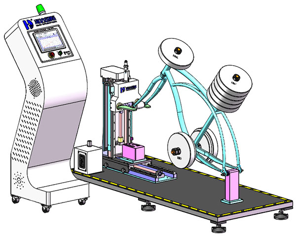 本機用于模擬自行車在騎行時前輪遇到障礙物時可承受地面障礙物沖擊的能力,在進(jìn)行沖擊試驗后觀察車架前叉組合件的變形量的大小及支架是否出現(xiàn)裂紋,從而判斷產(chǎn)品合格與否。
